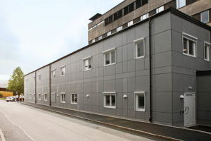 Sjukhusmiljöer har väldigt höga och krav, både vad gäller att klara av en steril miljö, hårda tillgänglighetskrav och även larm och kallelsesystem som i detta fall integreras med befintliga system. Till Östra sjukhuset byggdes specialmoduler för att tillgodose kraven men de är i grunden baserade på Expandias K2000-moduler. De två byggnaderna består totalt av 26 st. moduler i två våningar och har fasadskivor i grått kompositmaterial för att passa in med övriga byggnader i området.